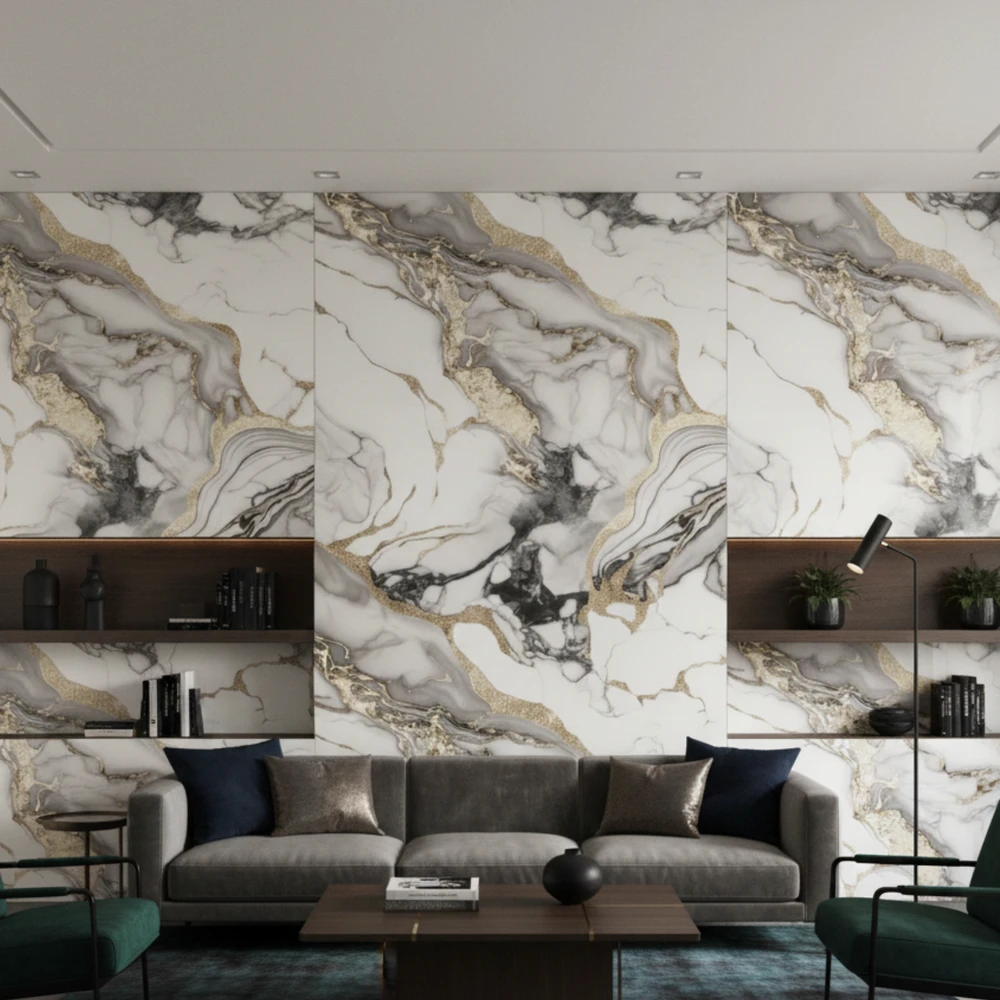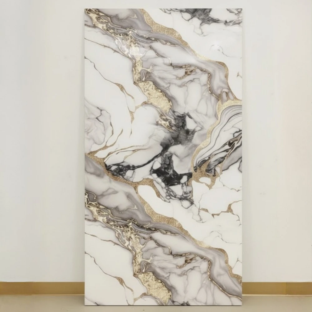 Format 270 cm × 120 cm × 3 mm zapewnia bardzo efektowne pokrycie ściany przy minimalnej liczbie łączeń, dzięki czemu wzór marmuru prezentuje się spójnie, naturalnie i bez zaburzeń.