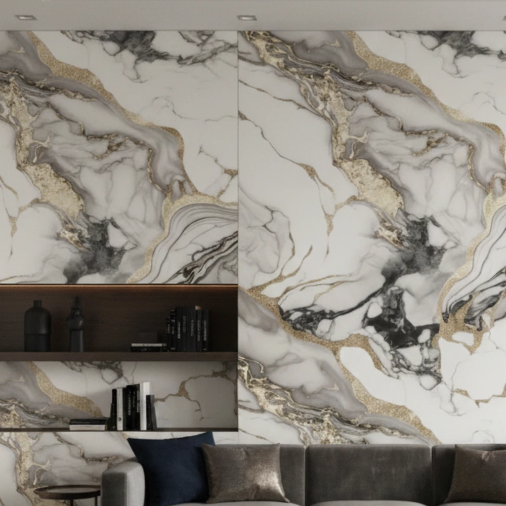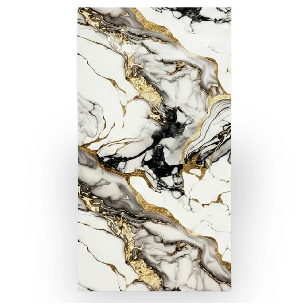 Panel wyróżnia się bardzo bogatą i dynamiczną strukturą marmuru. Kontrast między szarością, bielą, czernią i złotem nadaje ścianie niezwykłej głębi oraz prestiżowego charakteru. Świetnie sprawdza się w aranżacjach modern luxury, glamour, contemporary oraz minimalistycznych, gdzie panel staje się główną dekoracją wnętrza.